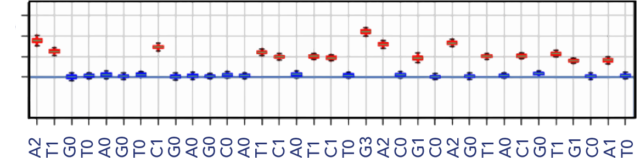 График ниже содержит репрезентативный пример полученных данных, показывающих распределение измеренного дифференциального сигнала по нескольким потокам нуклеотидов для одной последовательности матрицы. Потоки, которые, как ожидается, будут включать нуклеотиды, выделены красным. Не включающие нуклеотиды потоки показаны синим цветом и существенно не отклоняются от базовой линии.
