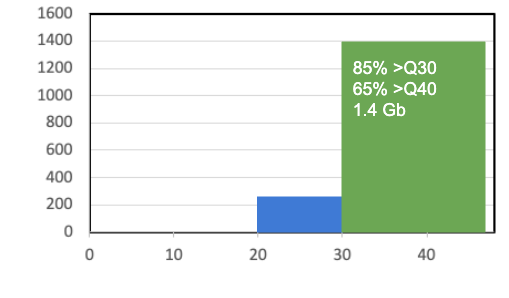 Платформа способна генерировать высококачественные последовательности данных и обеспечивает высокое разрешение и аналитическую чувствительность, необходимые для обнаружения редких вариантов и транскриптов. Обычно GenapSys генерирует данные последовательности, в которых более 80% оснований выше Q30 со средней длиной считывания, превышающей 150 п.н. Ниже представлен пример высококачественных данных GenapSys из геномной библиотеки, полученных во внешней лаборатории.
